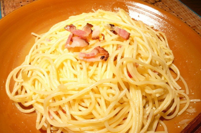 とある、むちゃくちゃうまいベーコン、ニンニク、鷹の爪、オリーブオイル、塩少々、以上!